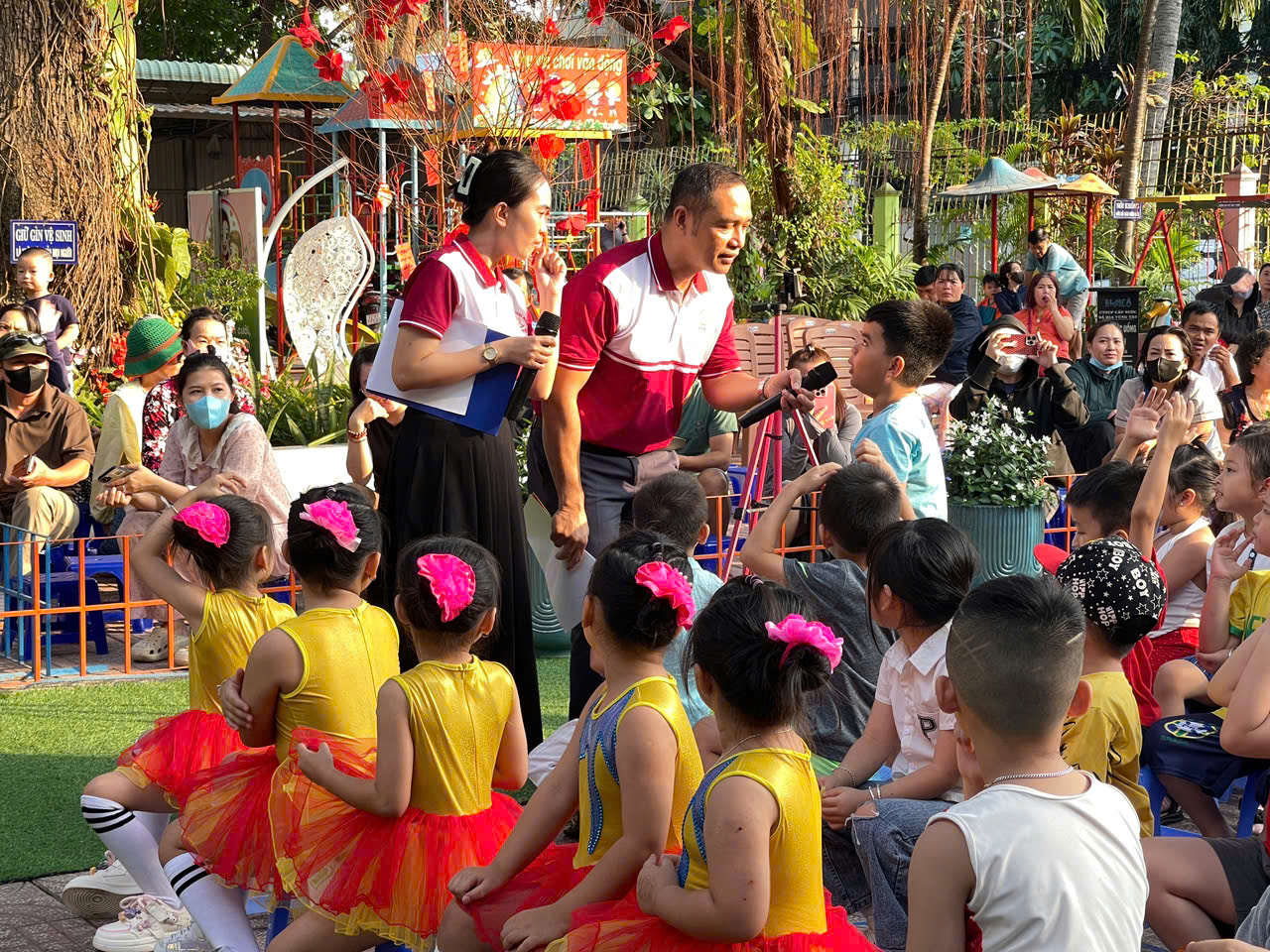 Thông qua các hoạt động ngoài trời, trẻ mở rộng vốn từ vựng về màu sắc, con vật và các hoạt động thường ngày. Đồng thời, các bé còn được rèn luyện kỹ năng giao tiếp, làm việc nhóm, cũng như sự mạnh dạn và tự tin khi thể hiện bản thân trước đám đông.